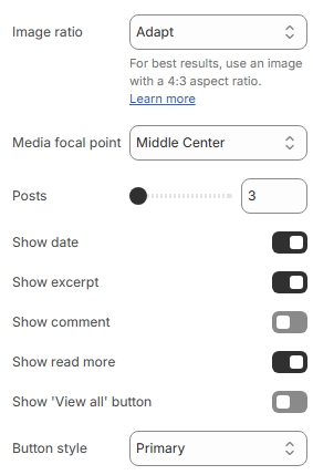 The Blog Post section offers both grid and carousel layouts, providing flexibility in how you display your blog posts. You can customize the number of columns shown on desktop, tablet, and mobile views to ensure an optimal reading experience across all devices. The section also allows you to adjust the background, color. These customization options allow you to create an attractive and engaging blog section that matches your site's style.