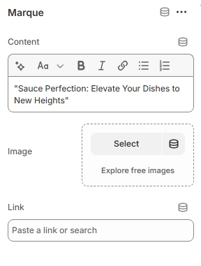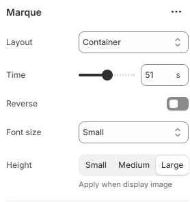 The Marquee section offers two motion options: scrolling from left to right or right to left, allowing you to choose the direction that best suits your design. You can customize the content within the marquee by adding either text or images, giving you flexibility in how you present your message or visuals. This section provides a dynamic and engaging way to highlight important information or showcase media with smooth scrolling effects.