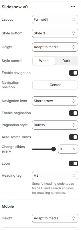 The slideshow section allows for full customization of text color for each individual slide, ensuring that the text stands out and complements the content. You can easily adjust the color of the text on each slide, allowing for a personalized look that matches your branding or design preferences.
