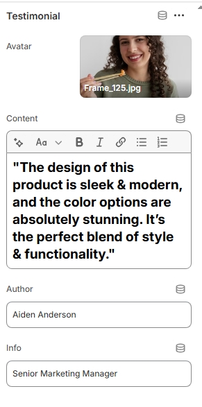 The Testimonial v2 section features a layout where an image is displayed on one side, and the testimonial text appears on the other side.